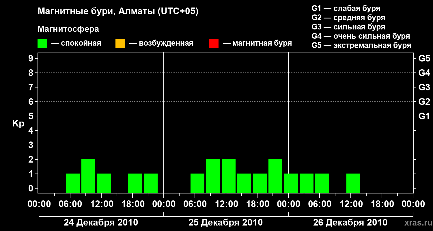 Изменения геомагнитного индекса Kp с 24 по 26 декабря 2010 года для средних широт