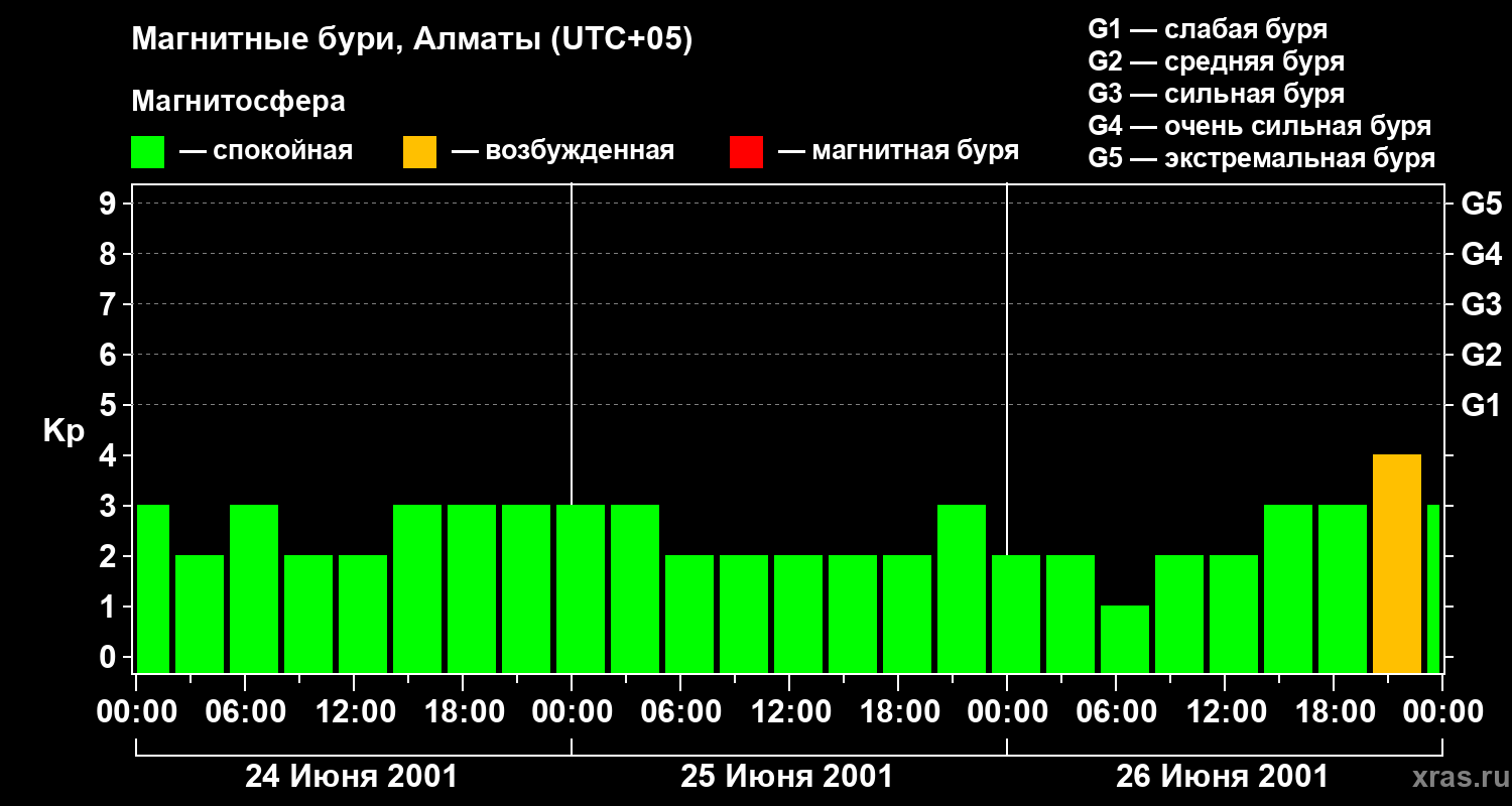 Изменения геомагнитного индекса Kp с 24 по 26 июня 2001 года для средних широт