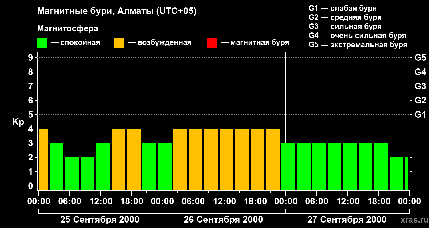 Изменения геомагнитного индекса Kp с 25 по 27 сентября 2000 года для средних широт