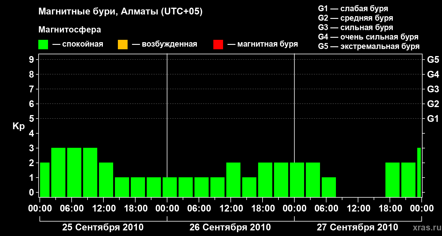 Изменения геомагнитного индекса Kp с 25 по 27 сентября 2010 года для средних широт