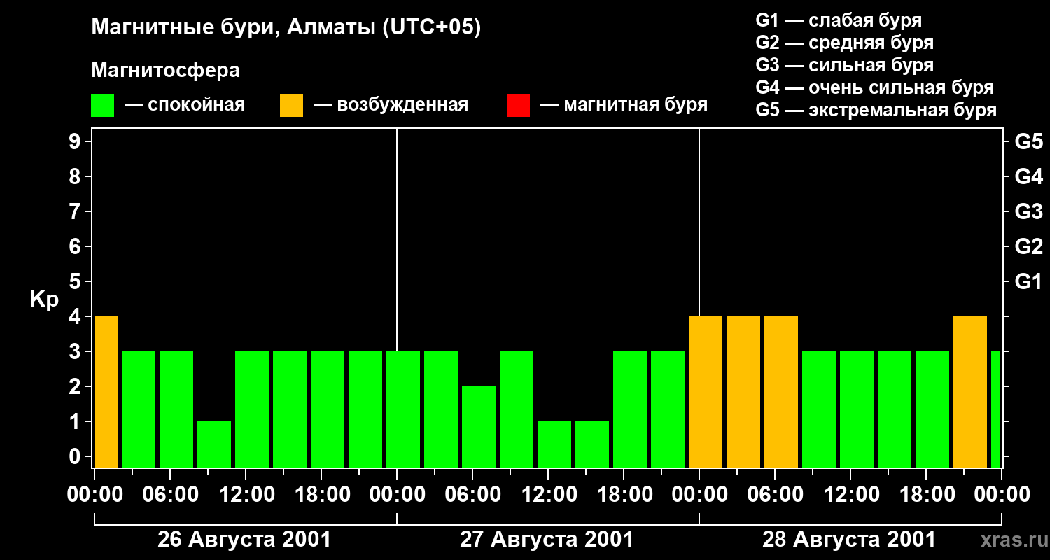 Изменения геомагнитного индекса Kp с 26 по 28 августа 2001 года для средних широт