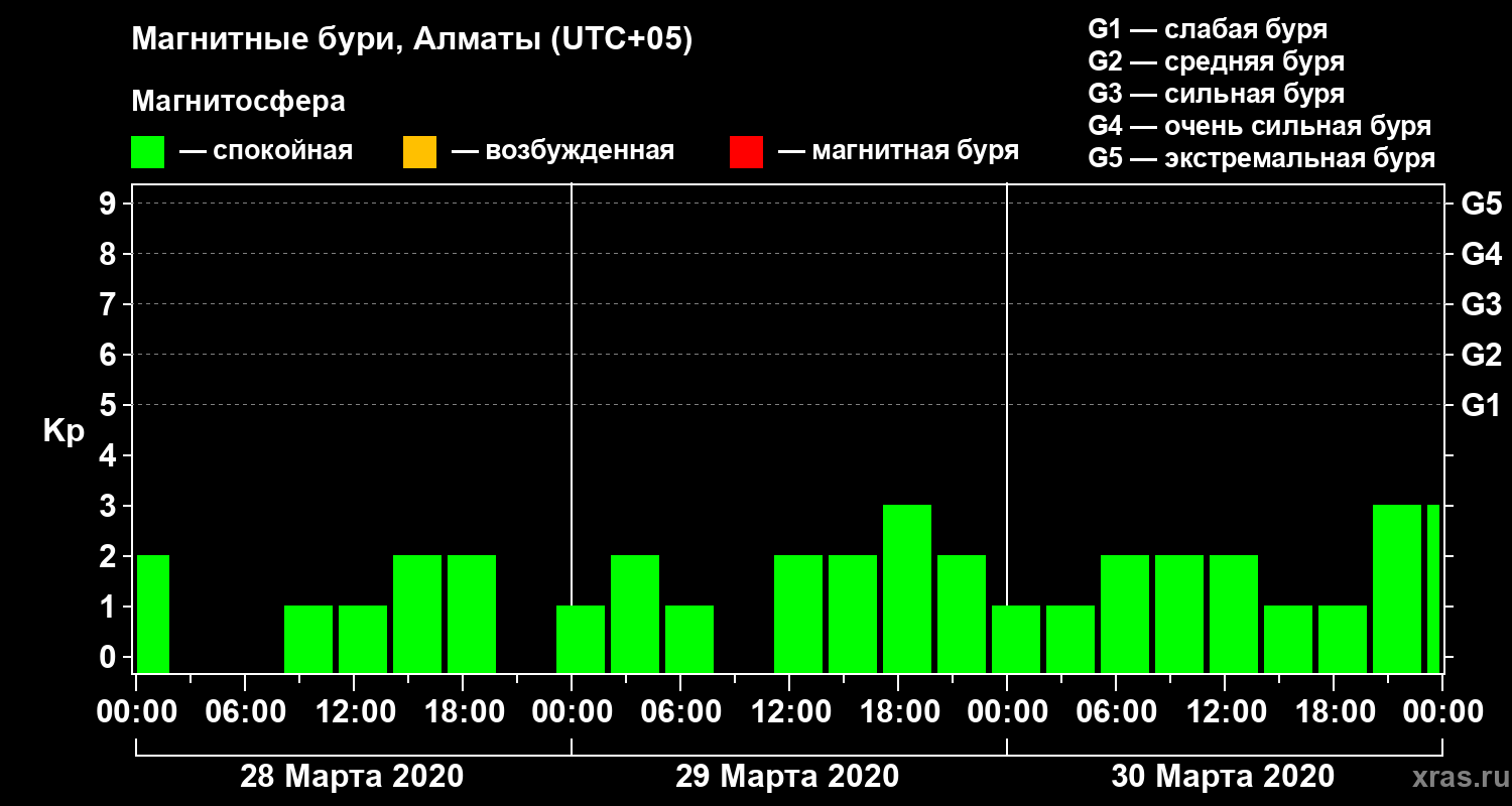 Изменения геомагнитного индекса Kp с 28 по 30 марта 2020 года для средних широт