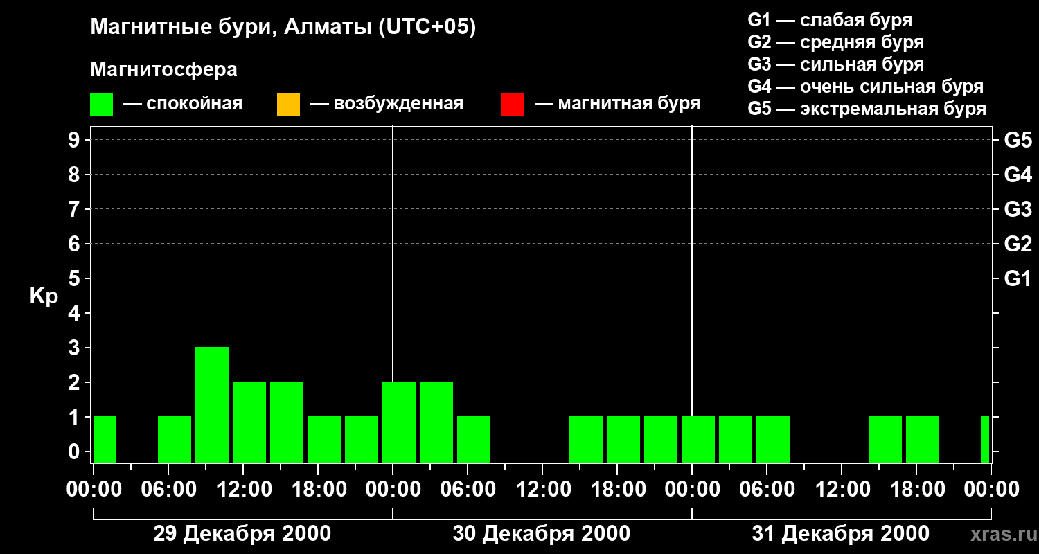 Изменения геомагнитного индекса Kp с 29 по 31 декабря 2000 года для средних широт