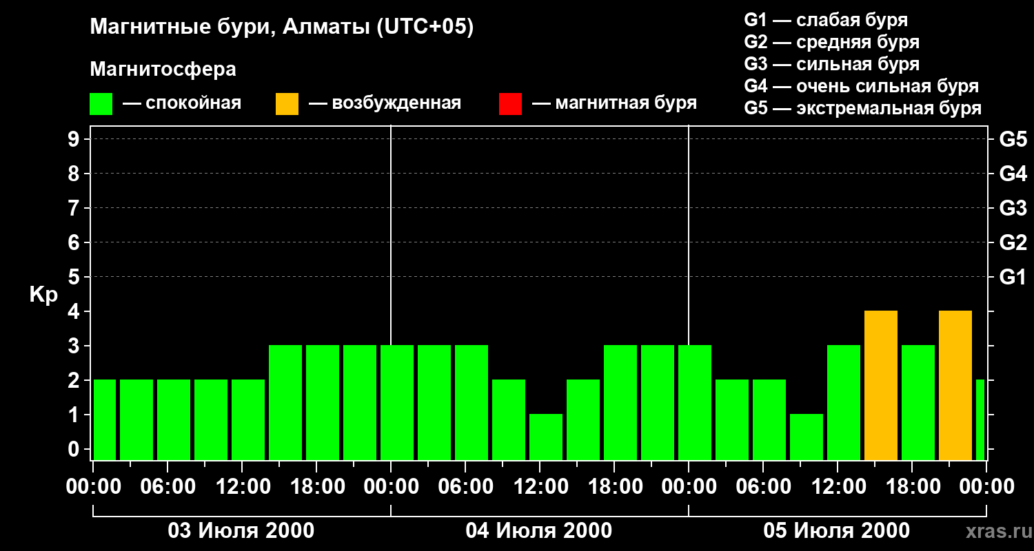 Изменения геомагнитного индекса Kp с 3 по 5 июля 2000 года для средних широт