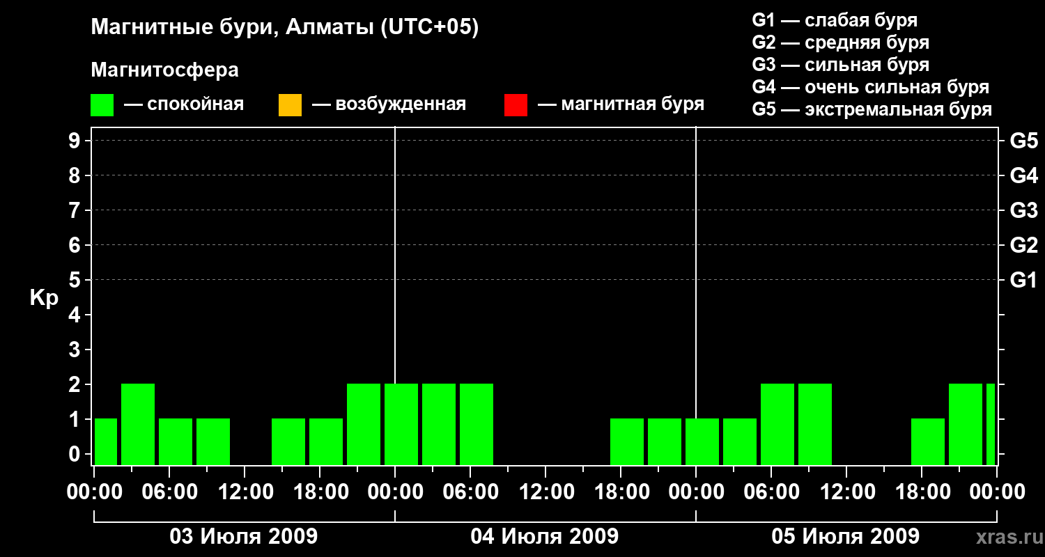 Изменения геомагнитного индекса Kp с 3 по 5 июля 2009 года для средних широт