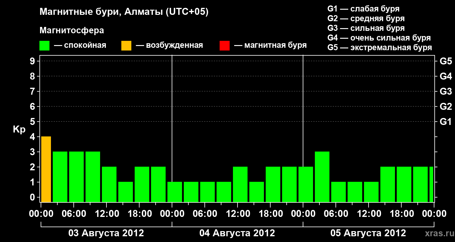 Изменения геомагнитного индекса Kp с 3 по 5 августа 2012 года для средних широт