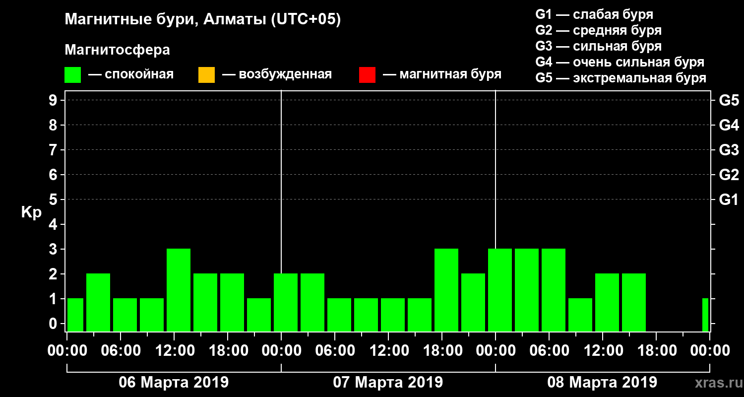 Изменения геомагнитного индекса Kp с 6 по 8 марта 2019 года для средних широт