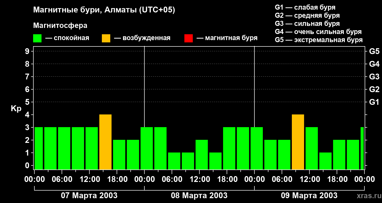 Изменения геомагнитного индекса Kp с 7 по 9 марта 2003 года для средних широт