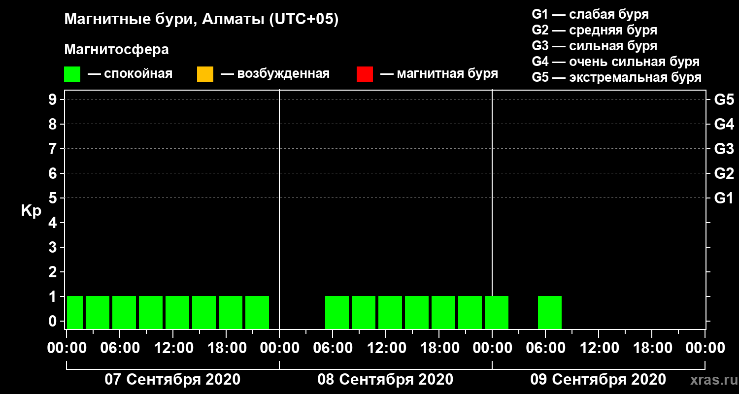 Изменения геомагнитного индекса Kp с 7 по 9 сентября 2020 года для средних широт
