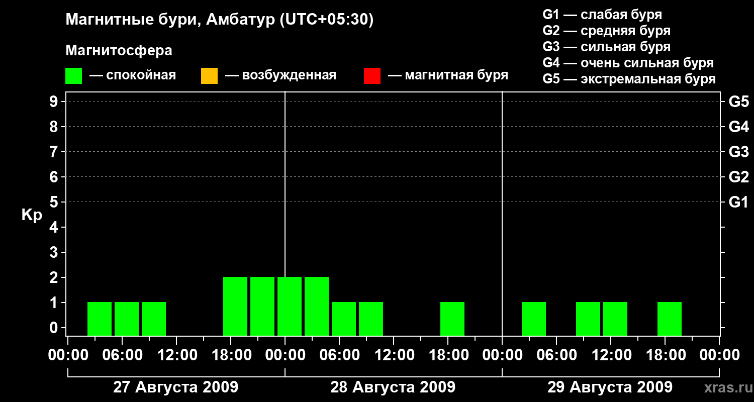 Изменения геомагнитного индекса Kp с 27 по 29 августа 2009 года для средних широт