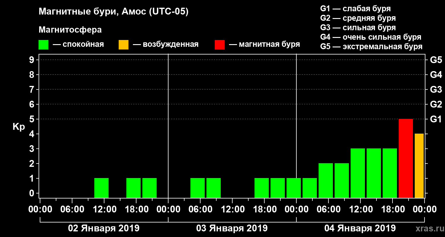 Изменения геомагнитного индекса Kp с 2 по 4 января 2019 года для средних широт