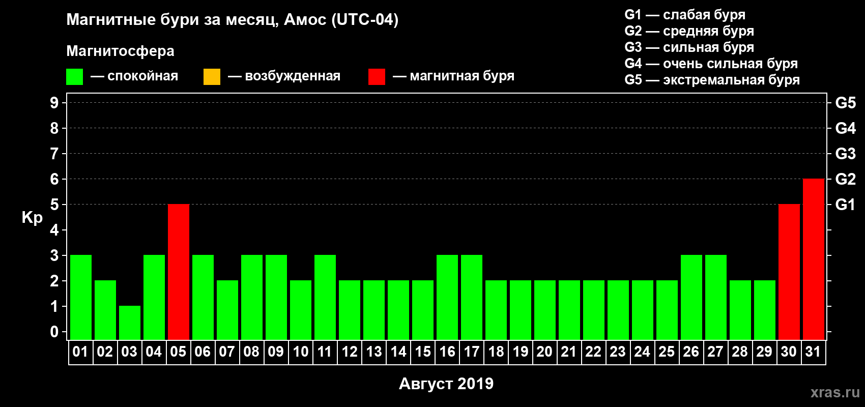 Изменения максимального суточного геомагнитного индекса Kp в августе 2019 года для средних широт