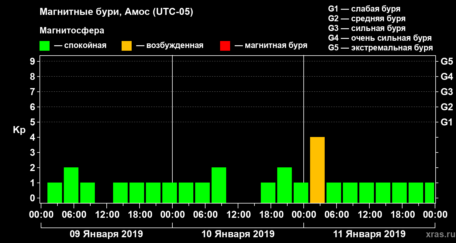 Изменения геомагнитного индекса Kp с 9 по 11 января 2019 года для средних широт