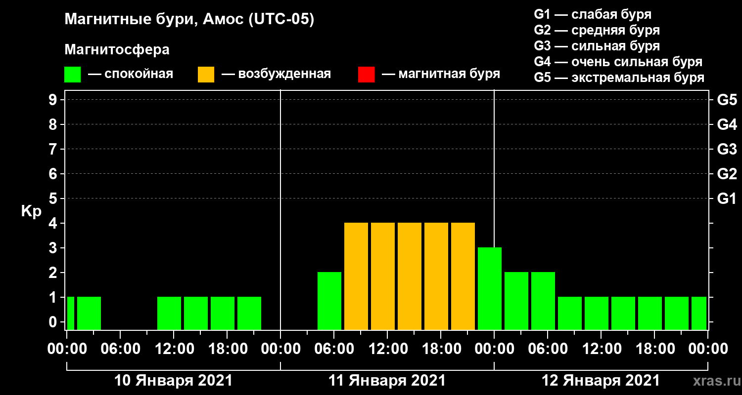 Изменения геомагнитного индекса Kp с 10 по 12 января 2021 года для средних широт