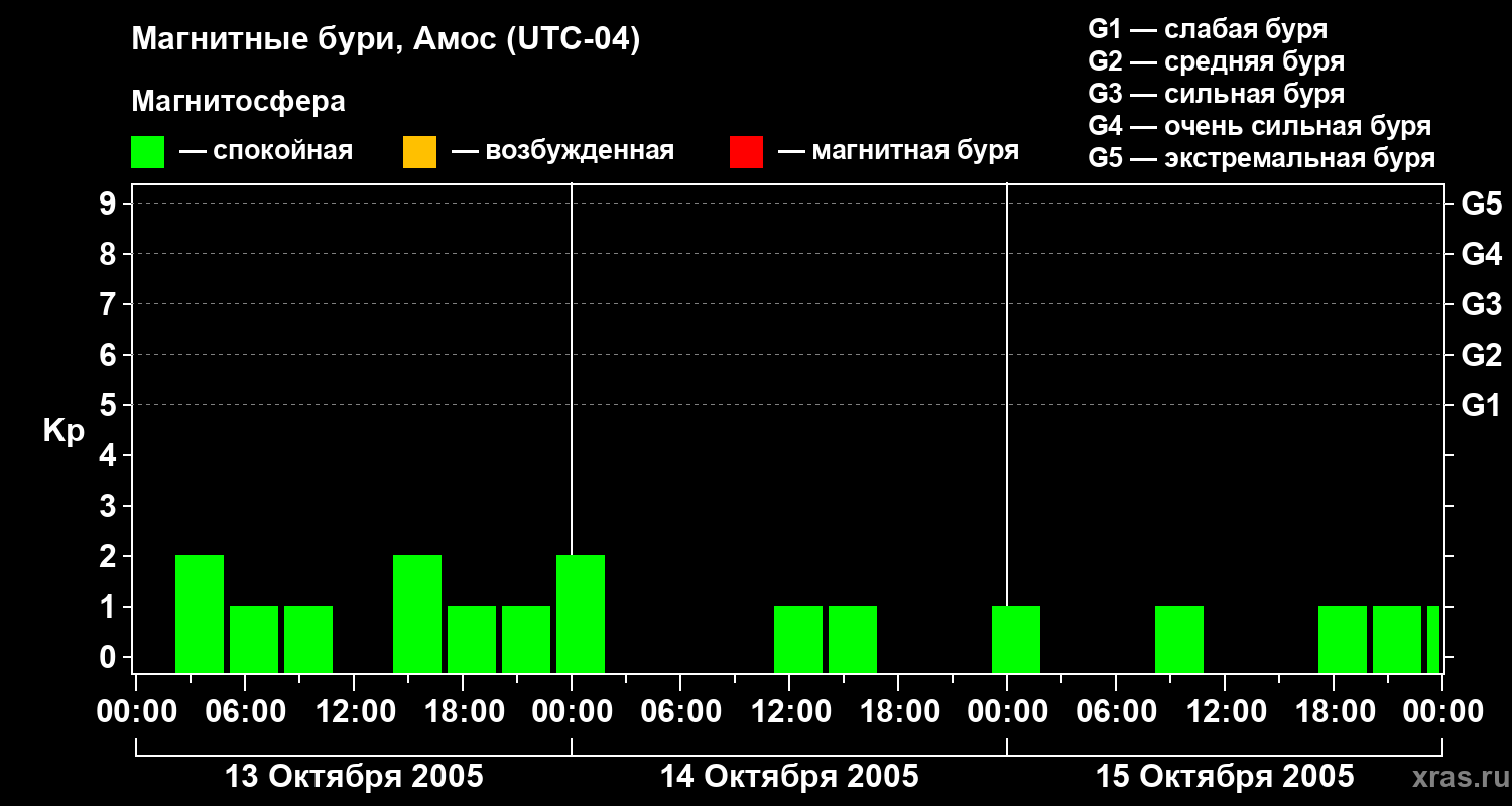 Изменения геомагнитного индекса Kp с 13 по 15 октября 2005 года для средних широт