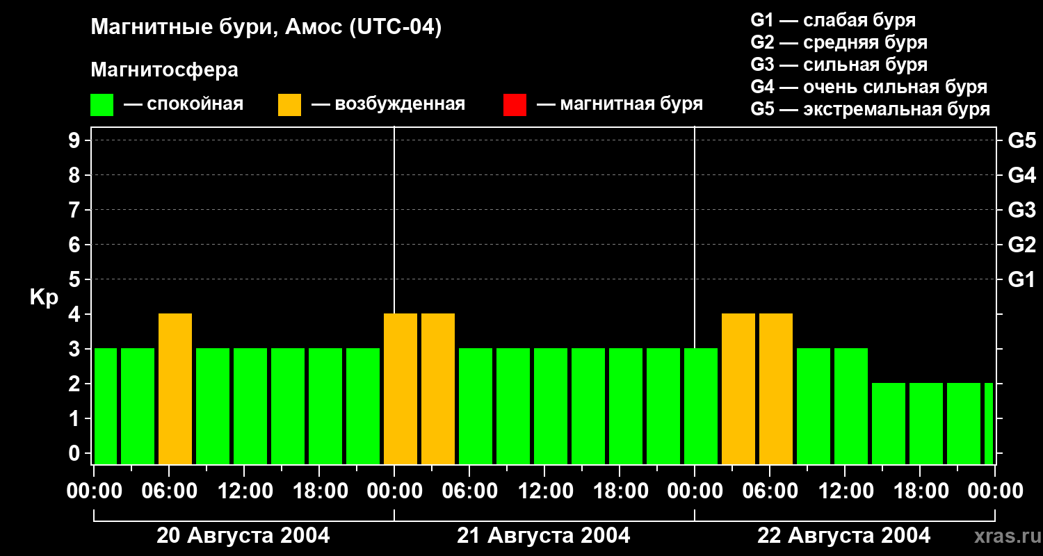 Изменения геомагнитного индекса Kp с 20 по 22 августа 2004 года для средних широт