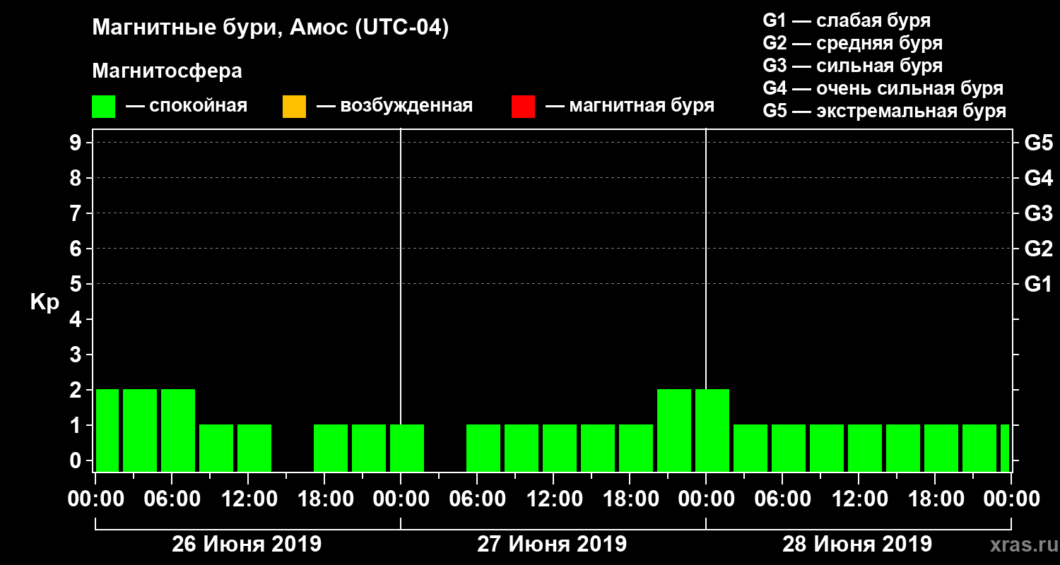 Изменения геомагнитного индекса Kp с 26 по 28 июня 2019 года для средних широт