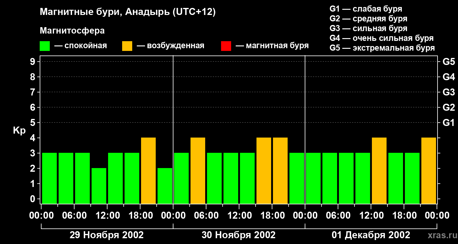 Изменения геомагнитного индекса Kp с 29 ноября по 1 декабря 2002 года для средних широт