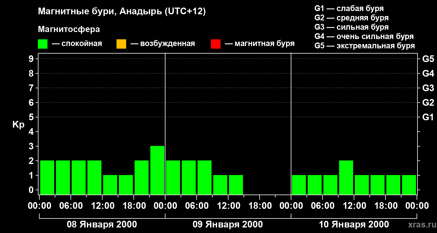Изменения геомагнитного индекса Kp с 8 по 10 января 2000 года для средних широт