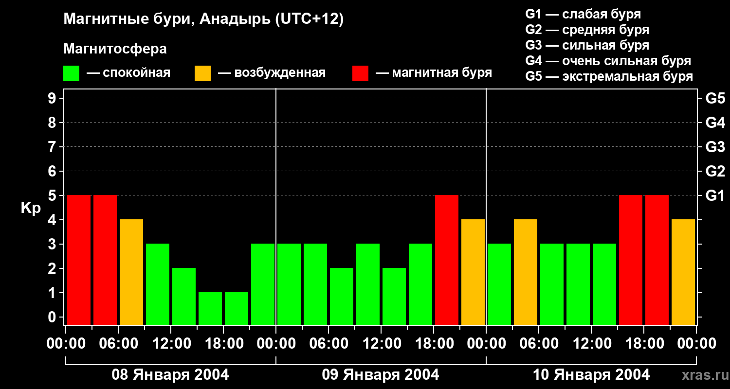 Изменения геомагнитного индекса Kp с 8 по 10 января 2004 года для средних широт