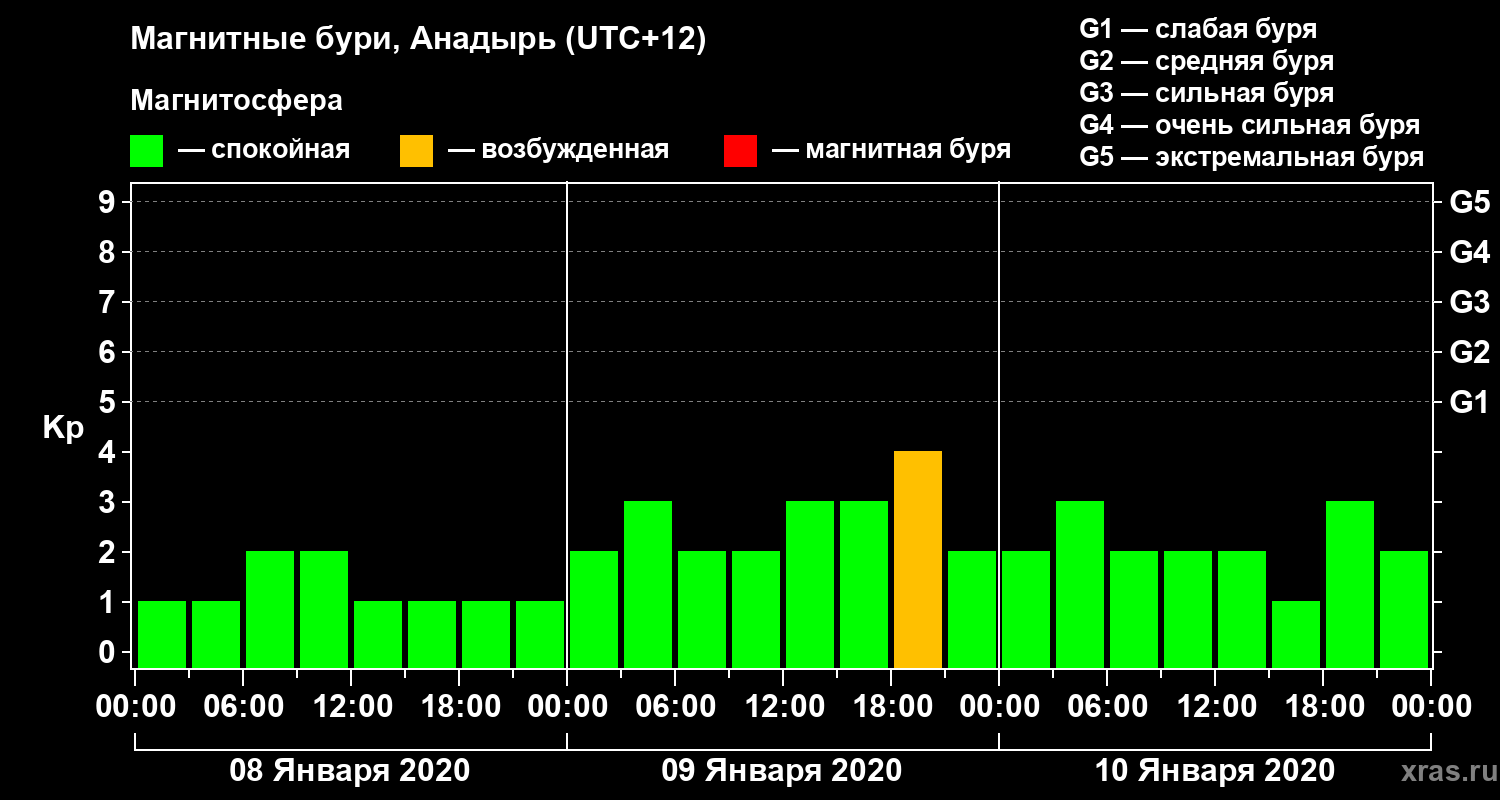 Изменения геомагнитного индекса Kp с 8 по 10 января 2020 года для средних широт