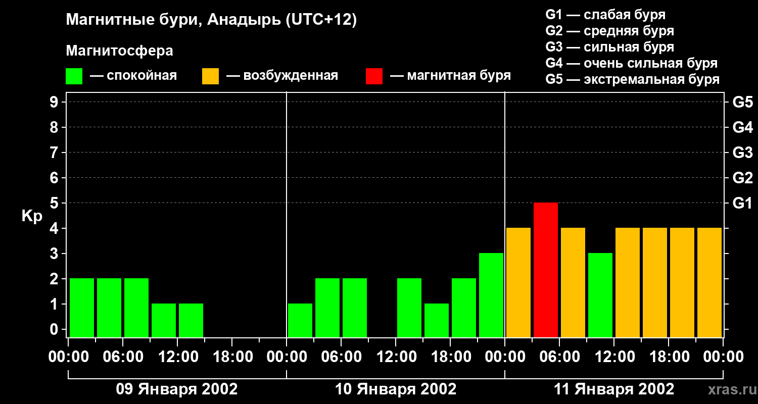 Изменения геомагнитного индекса Kp с 9 по 11 января 2002 года для средних широт