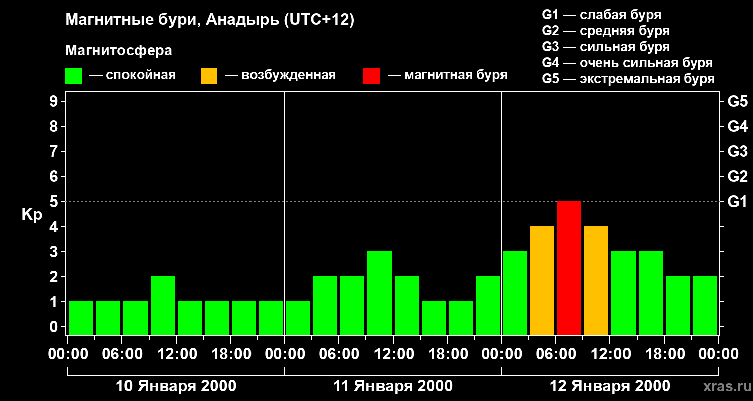 Изменения геомагнитного индекса Kp с 10 по 12 января 2000 года для средних широт