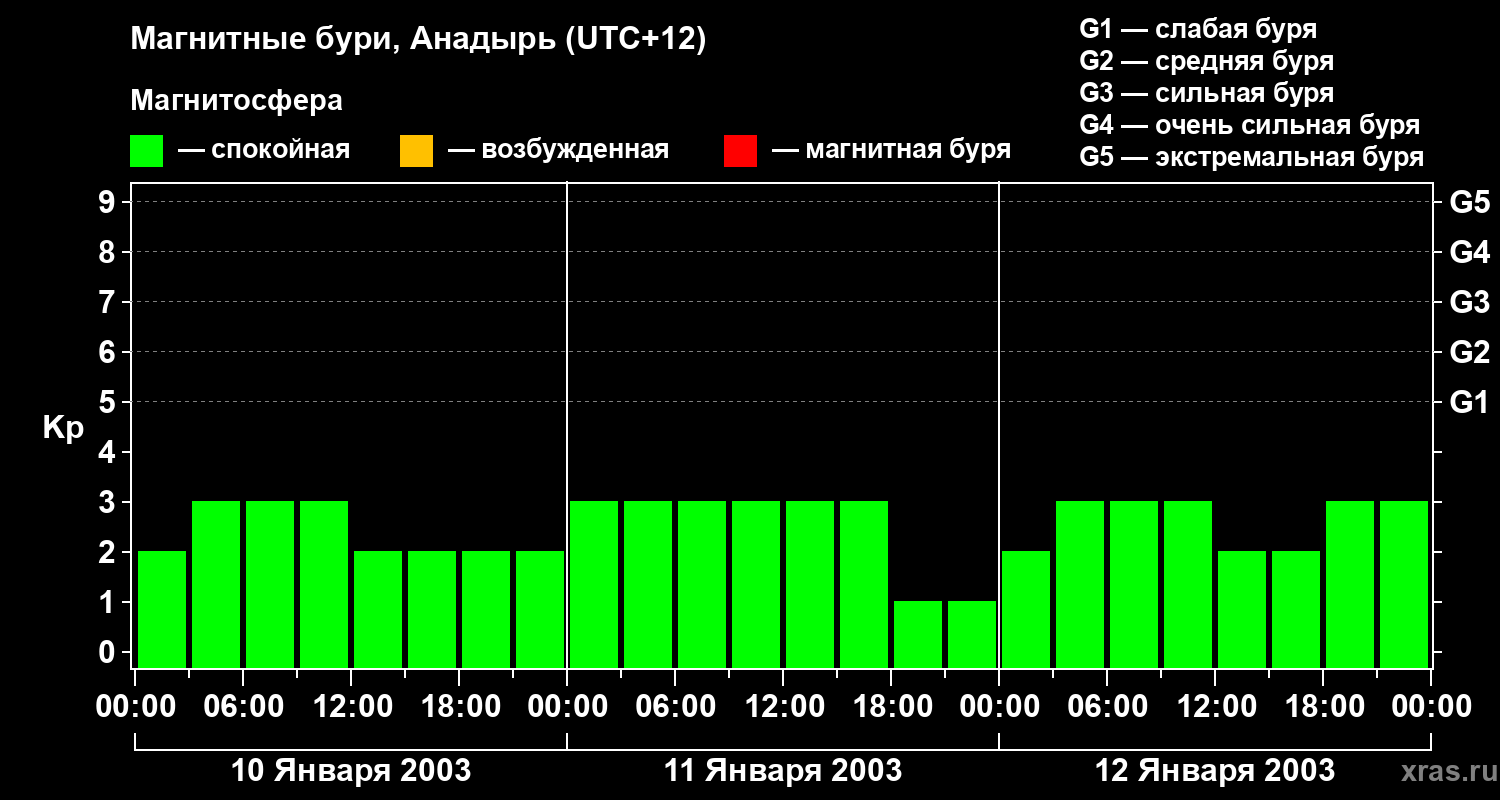 Изменения геомагнитного индекса Kp с 10 по 12 января 2003 года для средних широт