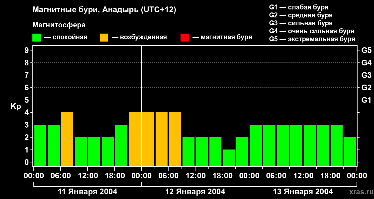 Изменения геомагнитного индекса Kp с 11 по 13 января 2004 года для средних широт