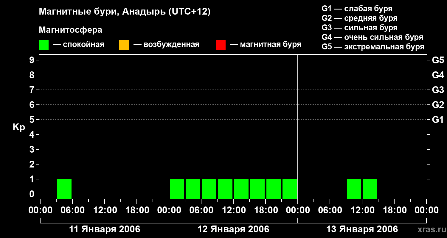 Изменения геомагнитного индекса Kp с 11 по 13 января 2006 года для средних широт