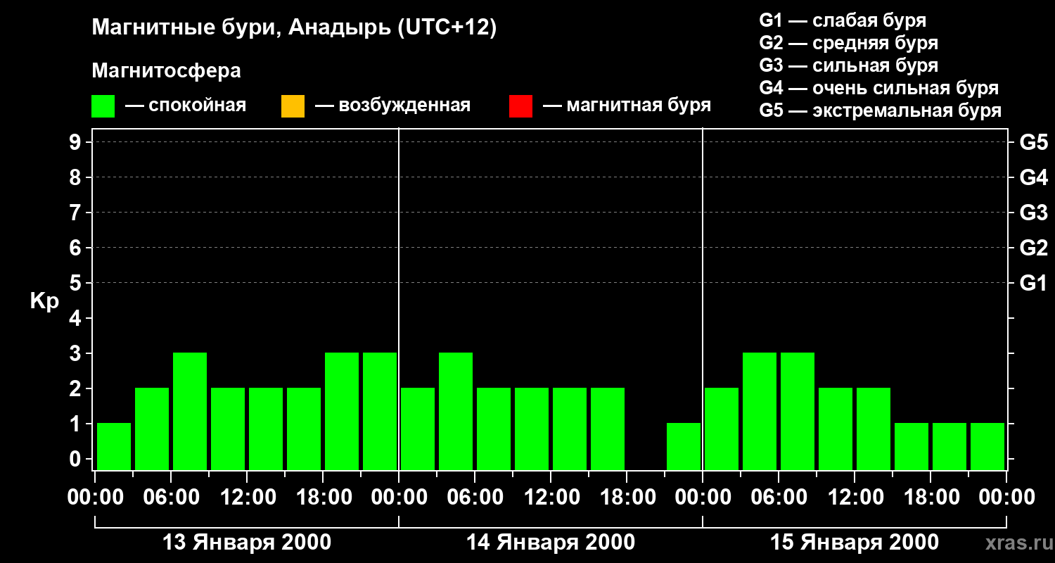 Изменения геомагнитного индекса Kp с 13 по 15 января 2000 года для средних широт