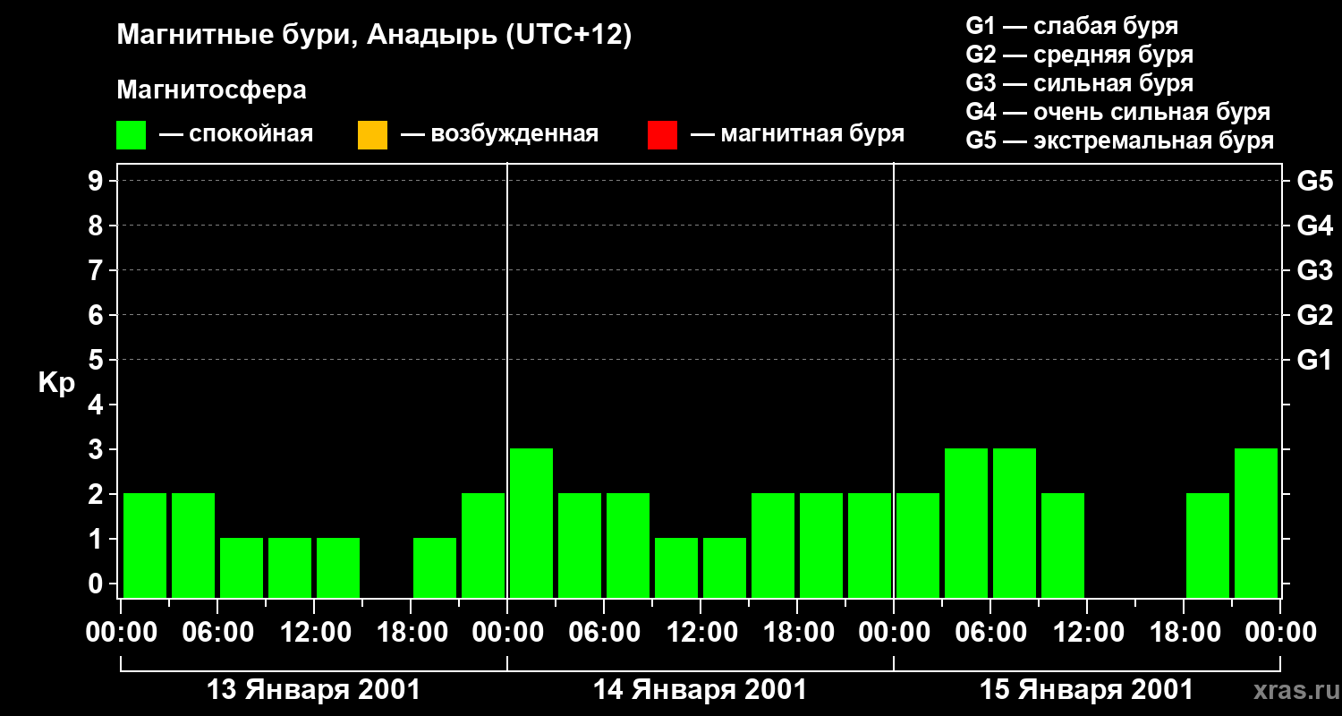 Изменения геомагнитного индекса Kp с 13 по 15 января 2001 года для средних широт
