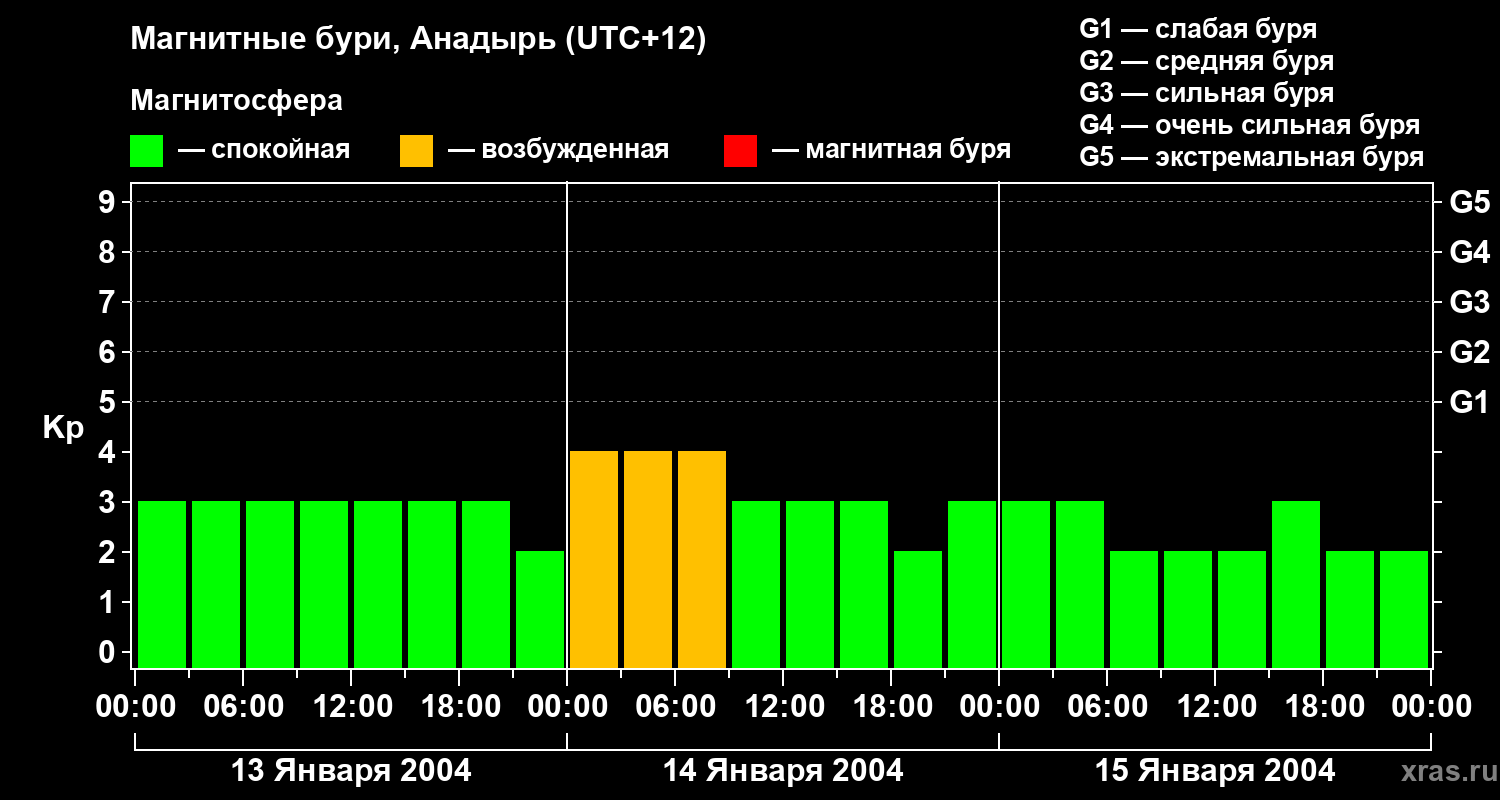 Изменения геомагнитного индекса Kp с 13 по 15 января 2004 года для средних широт
