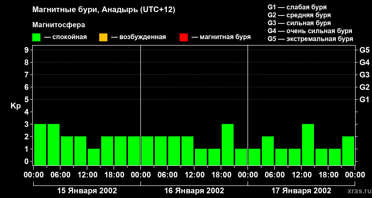 Изменения геомагнитного индекса Kp с 15 по 17 января 2002 года для средних широт