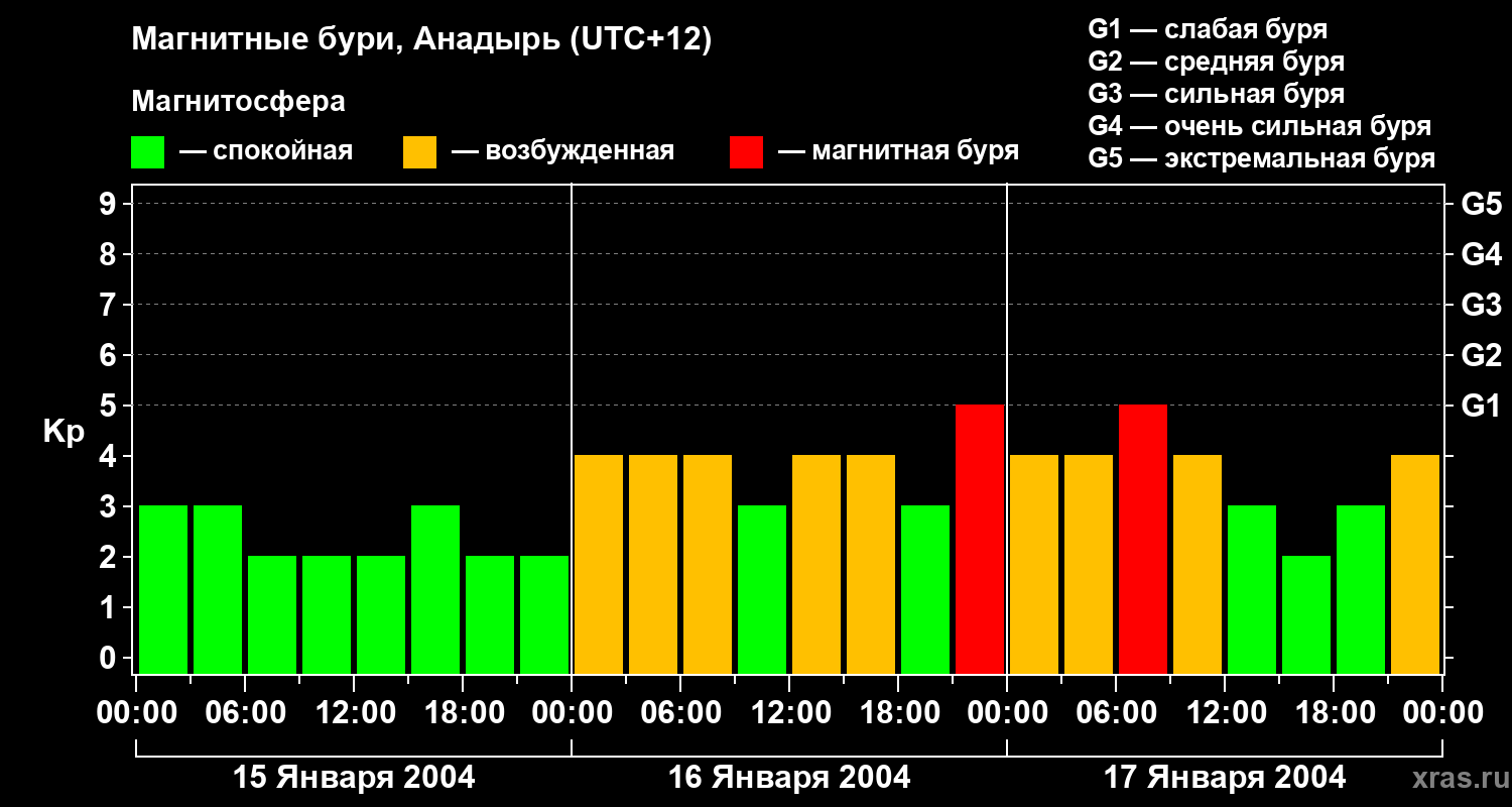 Изменения геомагнитного индекса Kp с 15 по 17 января 2004 года для средних широт