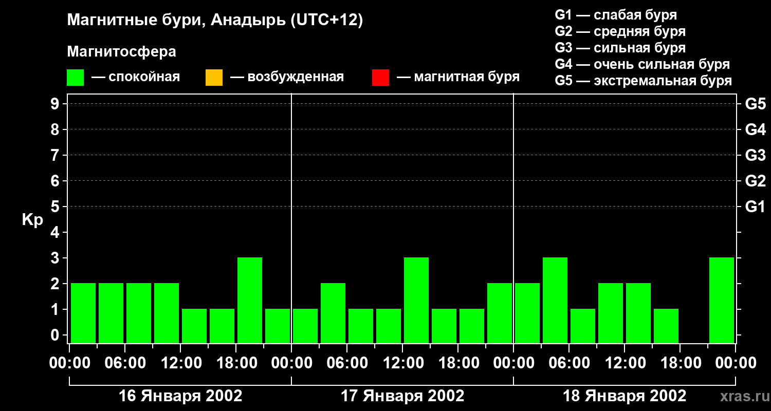 Изменения геомагнитного индекса Kp с 16 по 18 января 2002 года для средних широт