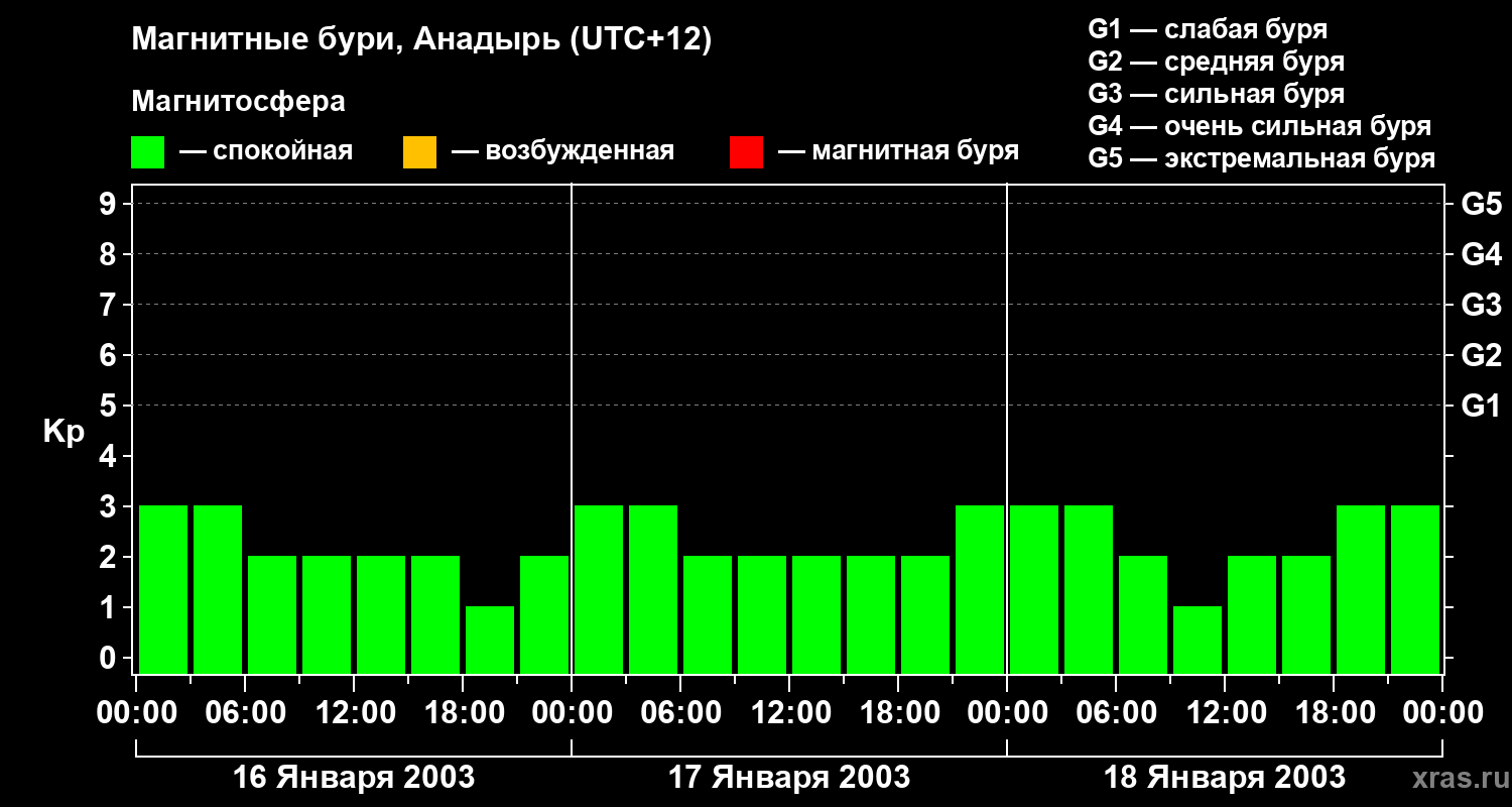 Изменения геомагнитного индекса Kp с 16 по 18 января 2003 года для средних широт