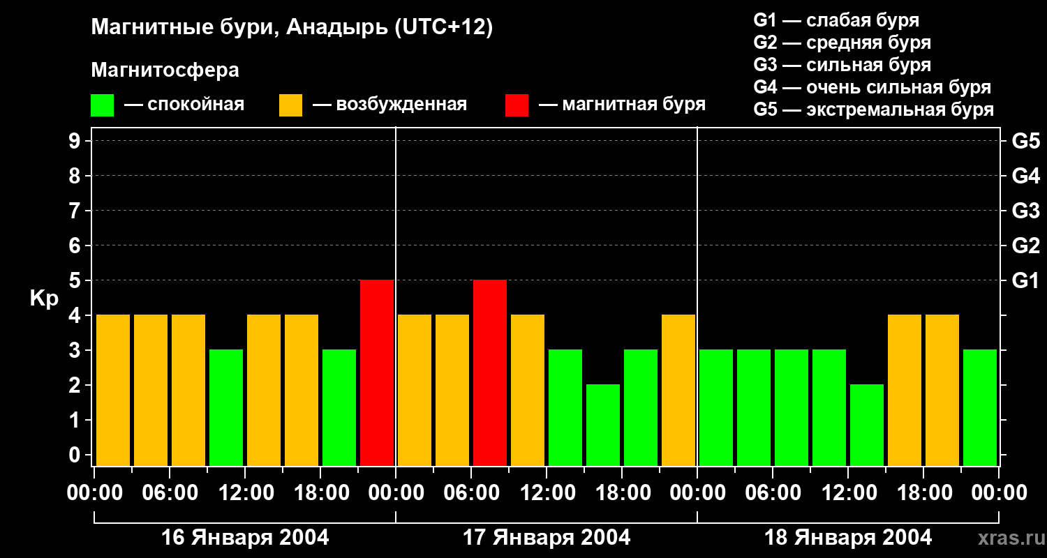 Изменения геомагнитного индекса Kp с 16 по 18 января 2004 года для средних широт
