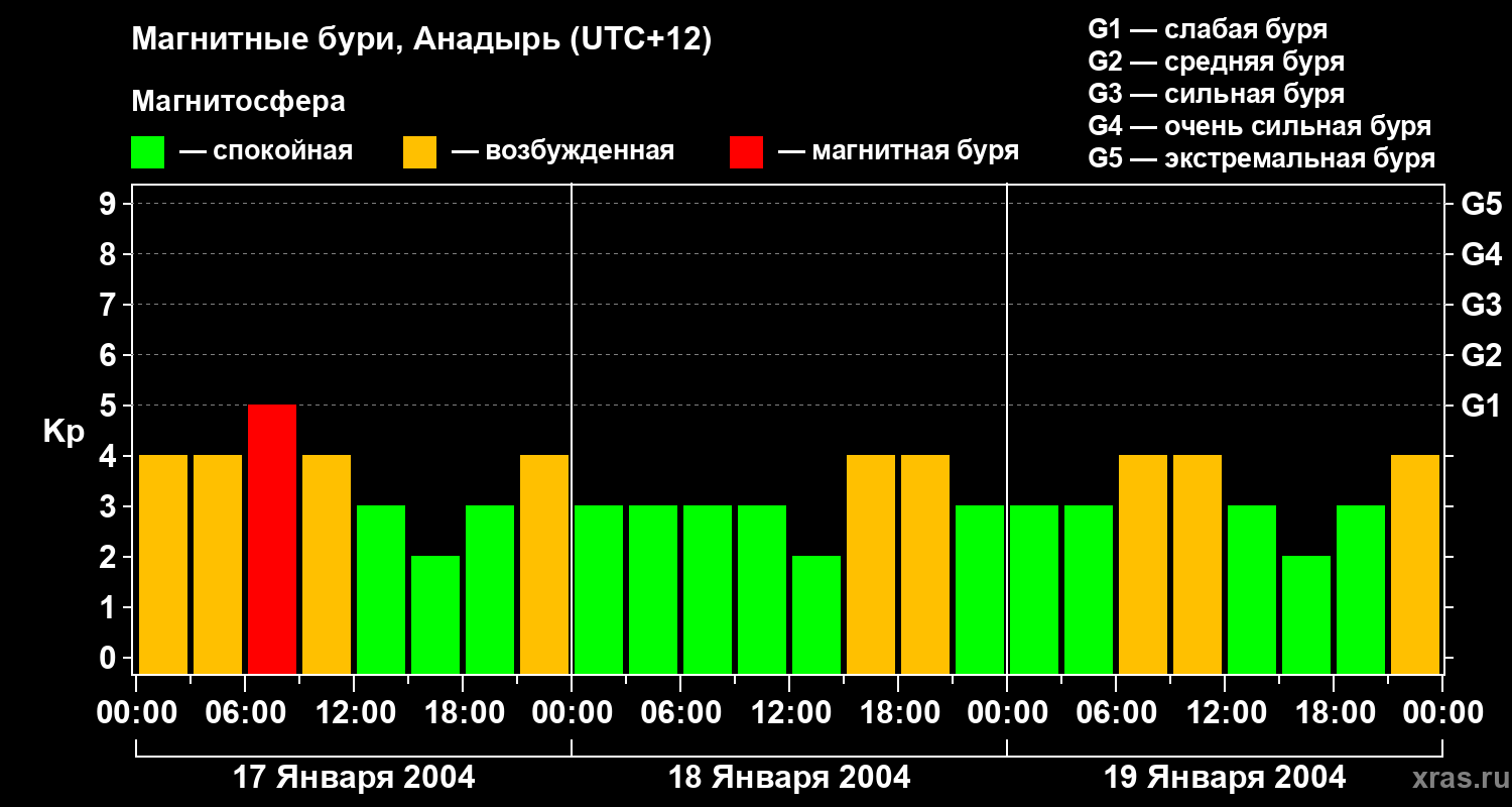 Изменения геомагнитного индекса Kp с 17 по 19 января 2004 года для средних широт