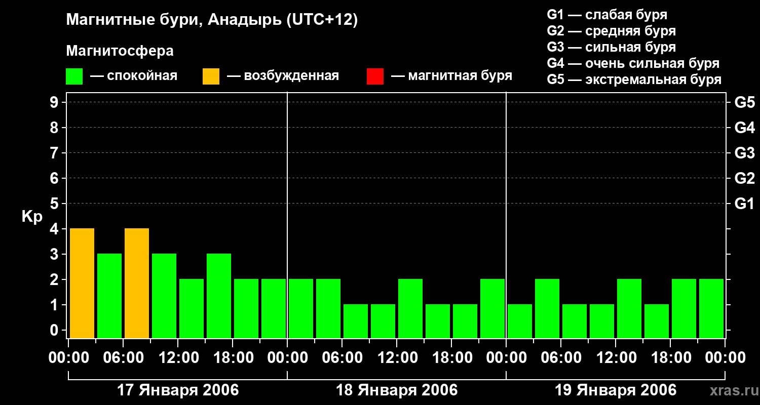 Изменения геомагнитного индекса Kp с 17 по 19 января 2006 года для средних широт