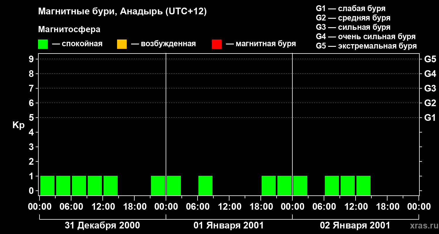 Изменения геомагнитного индекса Kp с 31 декабря 2000 года по 2 января 2001 года для средних широт
