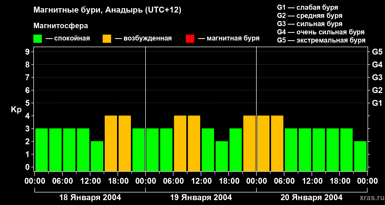 Изменения геомагнитного индекса Kp с 18 по 20 января 2004 года для средних широт