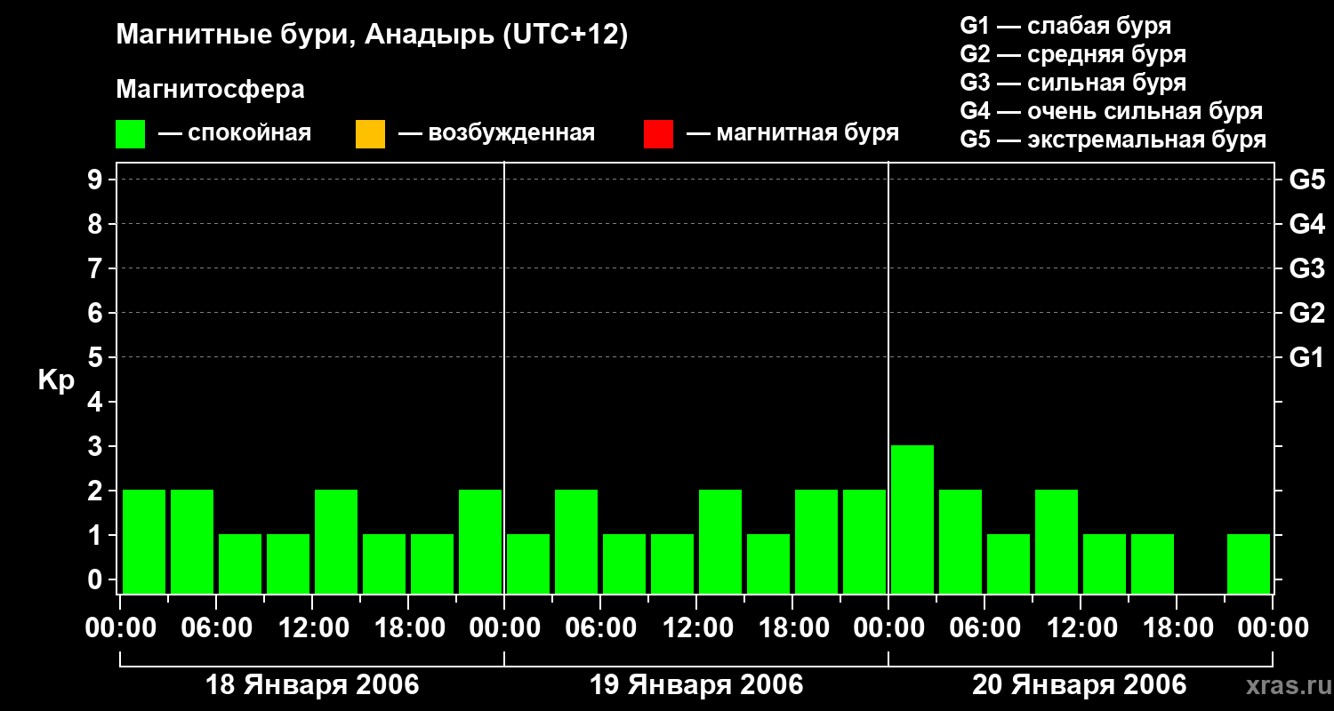 Изменения геомагнитного индекса Kp с 18 по 20 января 2006 года для средних широт