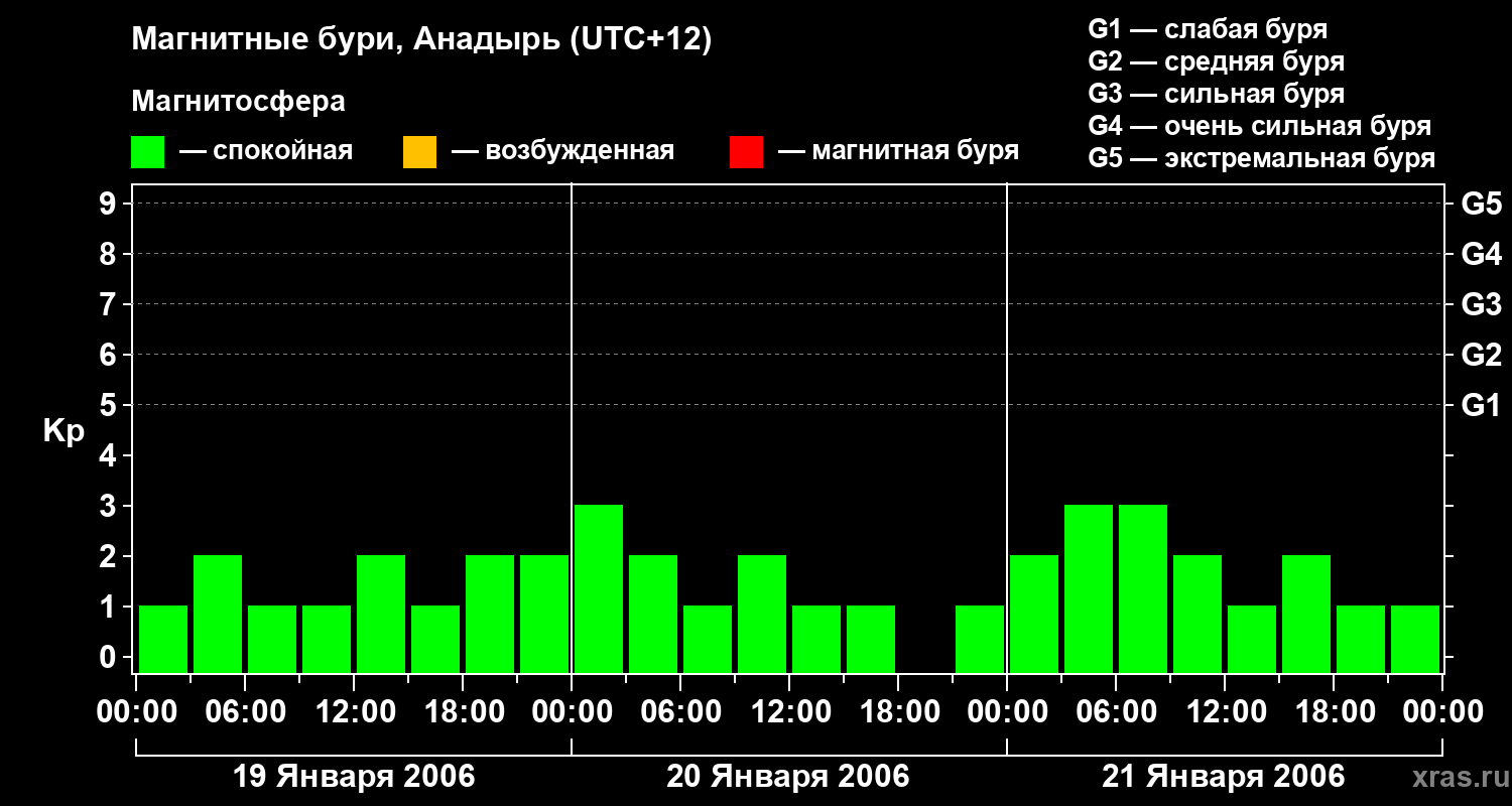 Изменения геомагнитного индекса Kp с 19 по 21 января 2006 года для средних широт