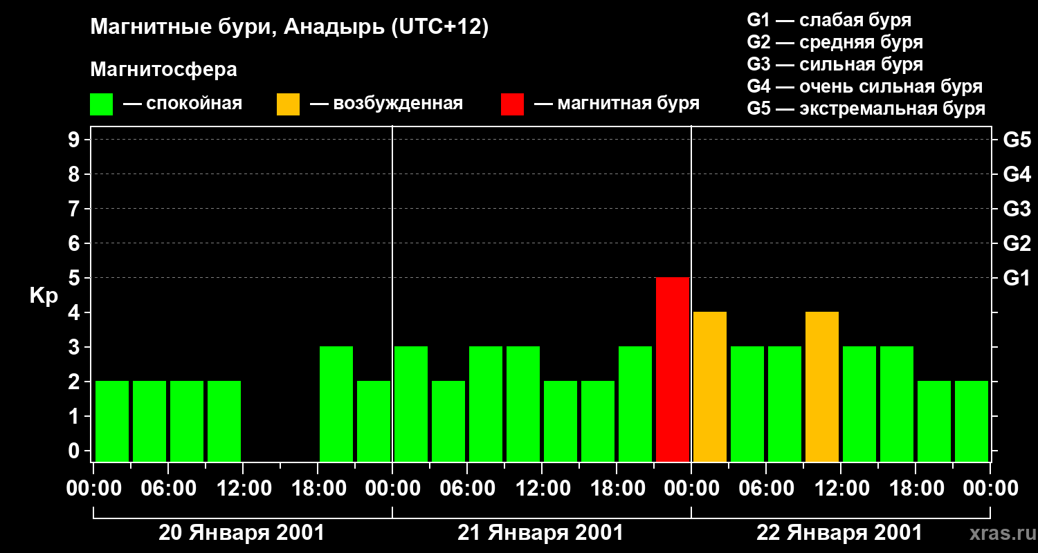 Изменения геомагнитного индекса Kp с 20 по 22 января 2001 года для средних широт