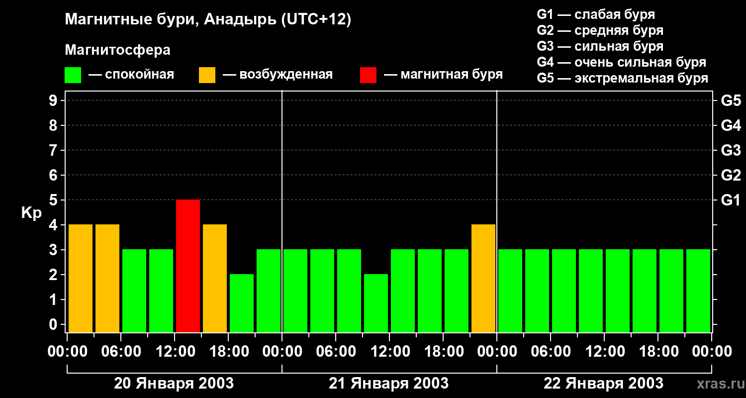 Изменения геомагнитного индекса Kp с 20 по 22 января 2003 года для средних широт