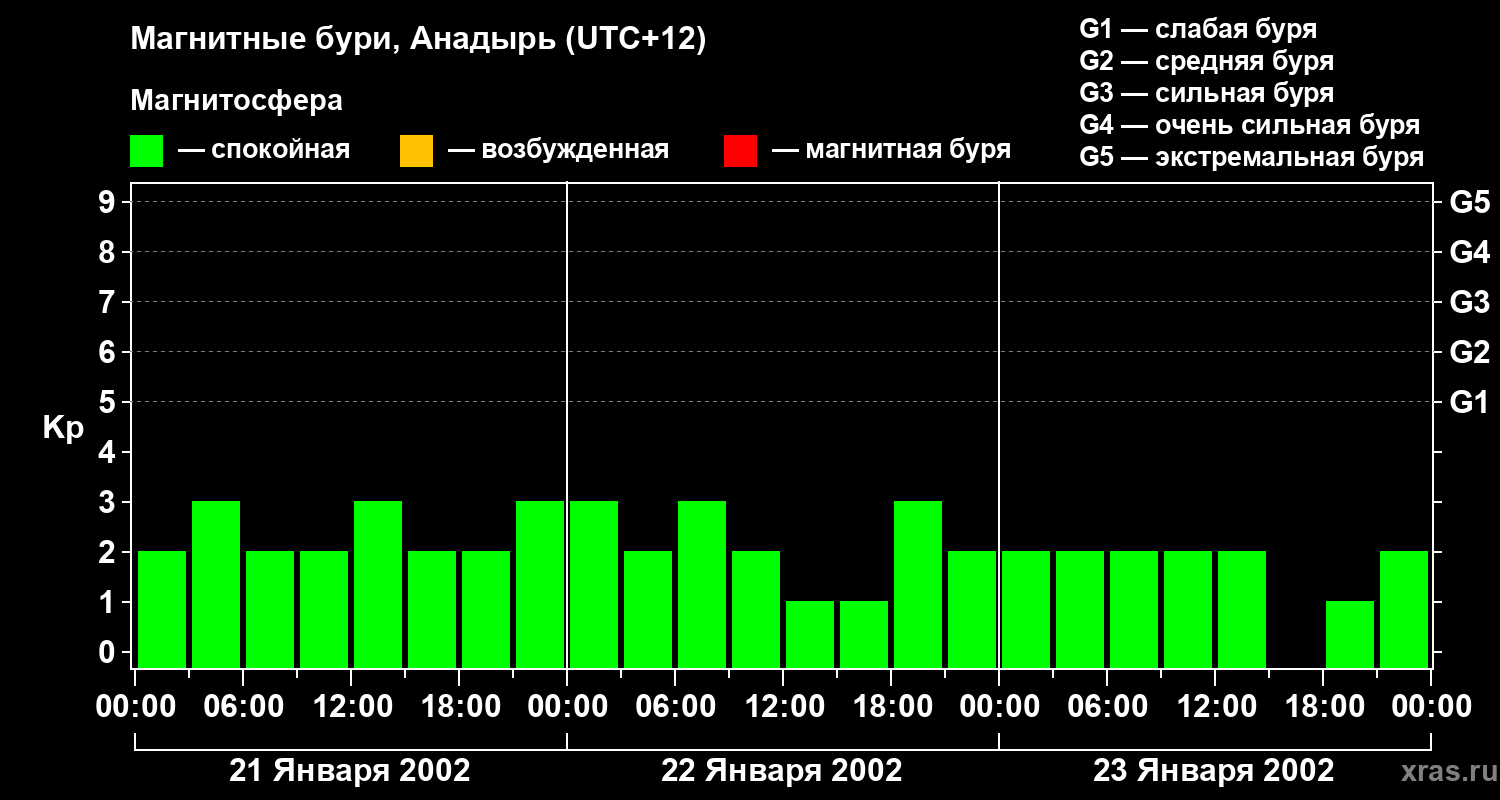 Изменения геомагнитного индекса Kp с 21 по 23 января 2002 года для средних широт