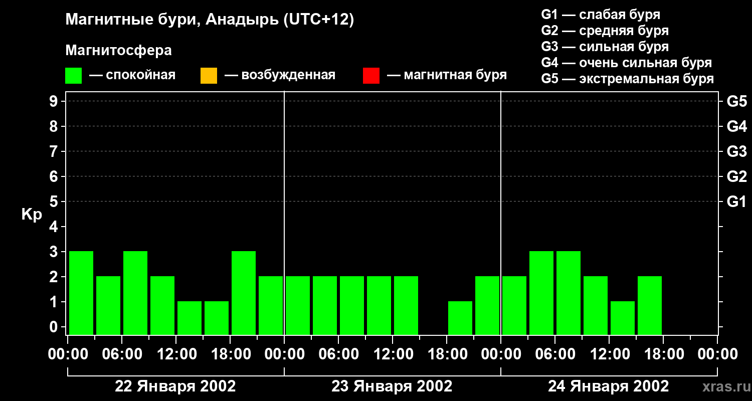 Изменения геомагнитного индекса Kp с 22 по 24 января 2002 года для средних широт