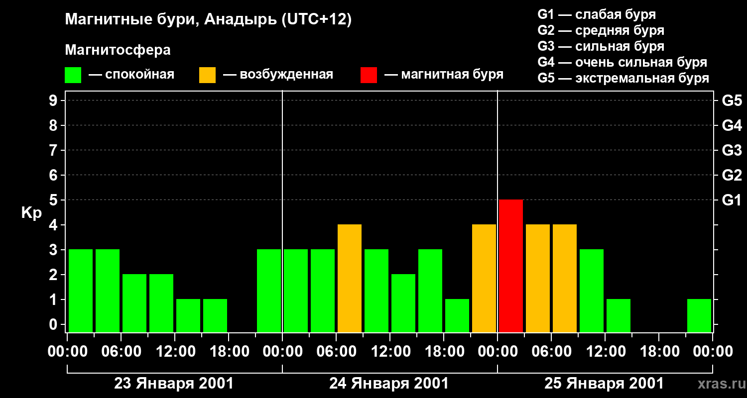 Изменения геомагнитного индекса Kp с 23 по 25 января 2001 года для средних широт