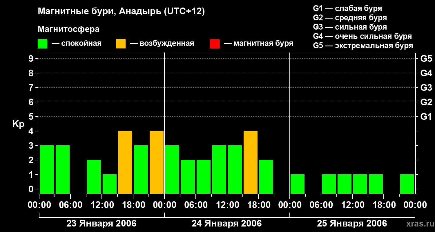 Изменения геомагнитного индекса Kp с 23 по 25 января 2006 года для средних широт